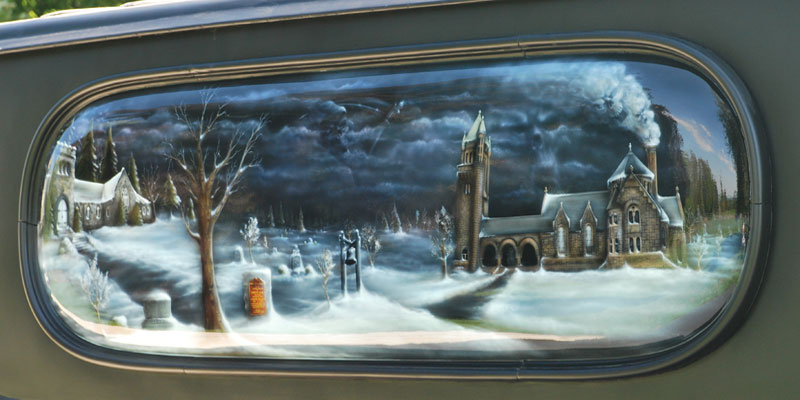 countless skulls are hidden throughout this eery cemetery mural on the side of a 1931 Brockway Hearse